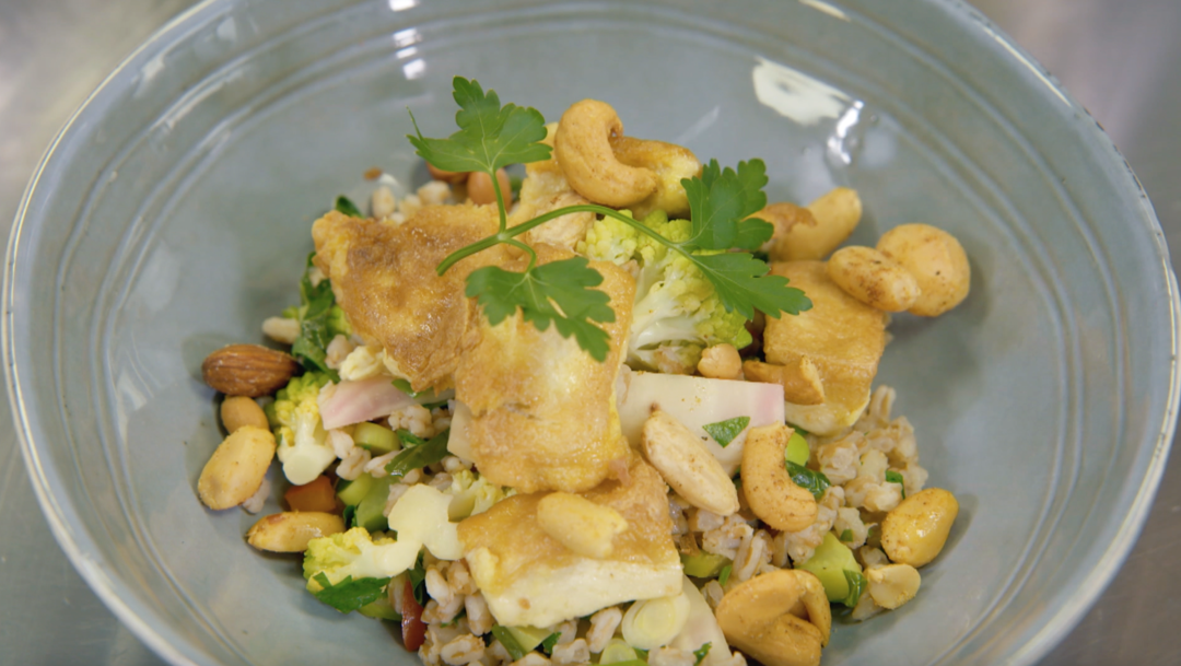 Crispy spelt salad with tofu, chioggia beetroot and nuts
