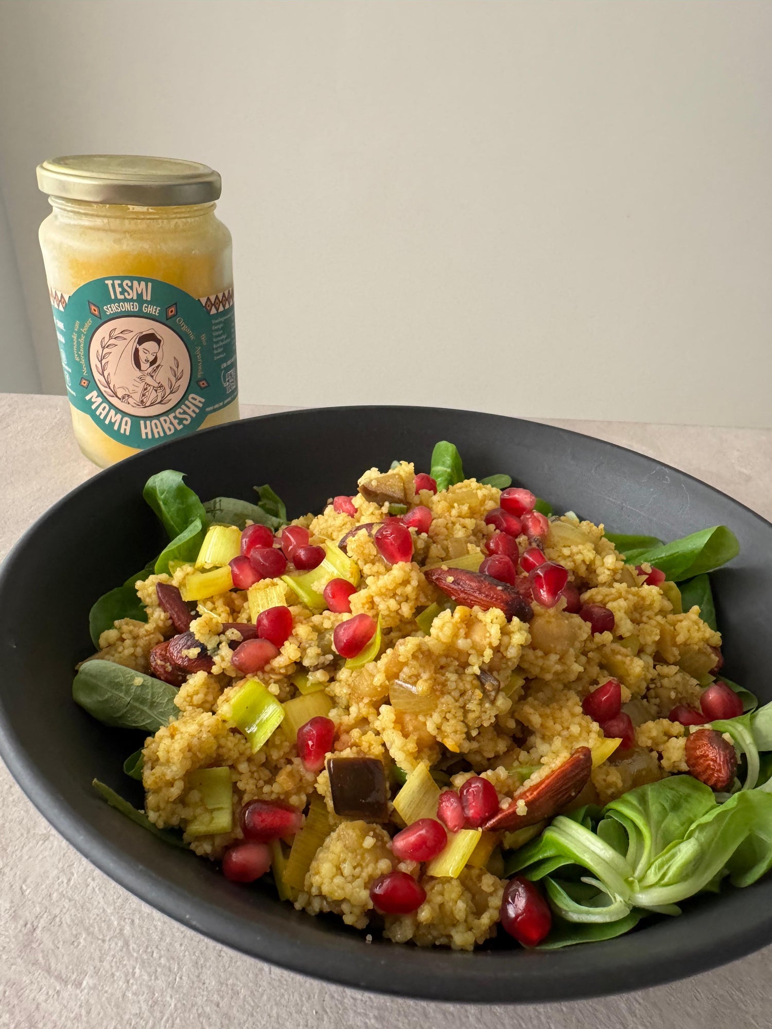 Pearl couscous salad with crispy chickpeas, falafel and yoghurt dressing
